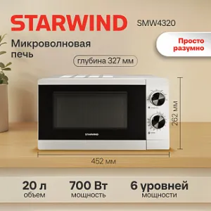 Микроволновая печь Starwind SMW4020 должна быть у каждой хозяйки на кухне, ведь она помогает быстро разогреть и разморозить продукты питания, а также приготовить новые блюда. Бытовой прибор выполнен в классическом белом цвете, который удачно гармонирует с дизайном любого кухонного пространства. Мощность микроволновки составляет порядка 700 Ватт, а объем рабочей камеры равен 20 л. Внутреннее пространство покрыто специальной эмалью, которая легко поддается очистке. Управление осуществляется с использованием двух механических регуляторов, а дверца открывается после нажатия на кнопку.