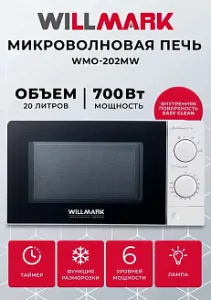 Микроволновая печь WILLMARK WMO-202MW выполнена в стильном, лаконичном дизайне, разработанном по главным тенденциям современности. Внутренняя камера объемом 20 литров с поворотным столом позволит равномерно подогреть или приготовить любое блюдо. Данная модель наделена всем необходимым и востребованным функционалом: таймер, функция разморозки и шестиуровневая регулировка мощности. Благодаря поворотным регуляторам вы сможете выставить необходимое время и мощность для приготовления блюда.
