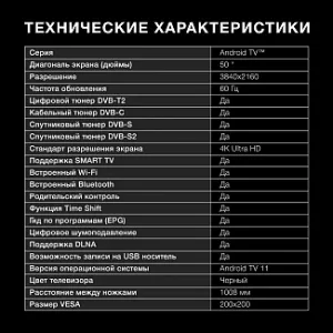 Экран данной модели имеет оптимальные характеристики как для просмотра качественного кино, так и для погружения в актуальные видеоигры. Он показывает изображение с разрешением до 3840х2160 пикселей, что соответствует формату 4K Ultra HD. Частота обновления дисплея составляет 60 Гц – это делает просмотр динамичных спортивных матчей и другие доступные развлечения плавными и богатыми на детали. Углы обзора телевизора составляют 178 градусов по обоим направлениям и усиливают эффект погружения в происходящее.