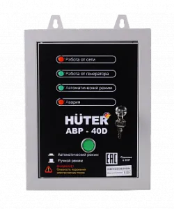 При аварийном отключении сетевого электропитания или при отклонении параметров электротока от номинальных значений блок автоматики Huter АВР 40D автоматически запускает генератор, таким образом обеспечивая потребителей электричеством.